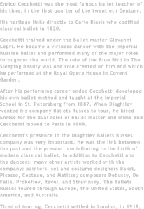 I will conclude with one more reference. It is generally admitted that the finest company of dancers ever seen in Western Europe was that formed by the late Serge Diaghileff, whose refined taste and innate artistry directed the whole of its brilliant existence from 1909 to 1929. It was to Cecchetti that Diaghileff entrusted the responsible task of maintaining the technical efficiency of that company which at one time numbered as many as a hundred dancers, including some of the greatest artists of the age.
