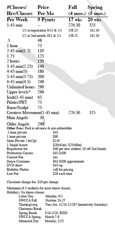 Tuition rates are based on the number of lessons held during the dance season and not the number of lessons per month, even though tuition is paid each month. Payments have been divided into 9 equal monthly installments for the dance year. Holidays have been taken into account and we do not pro-rate tuition payments due to missed classes.